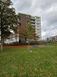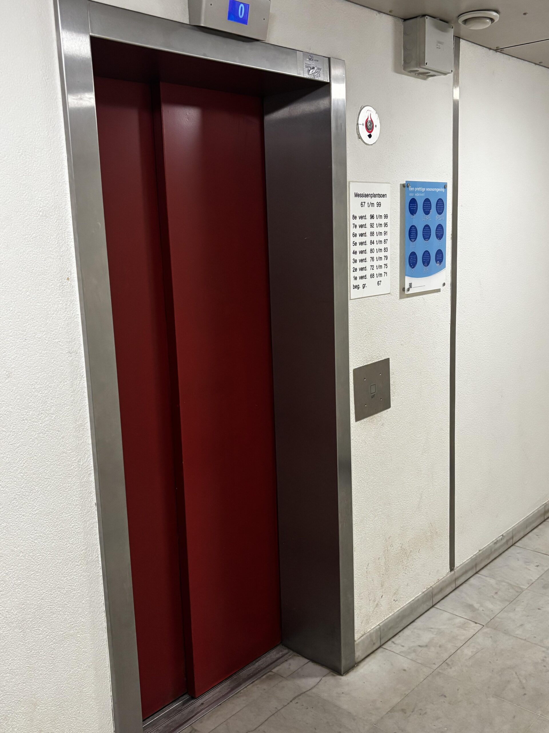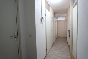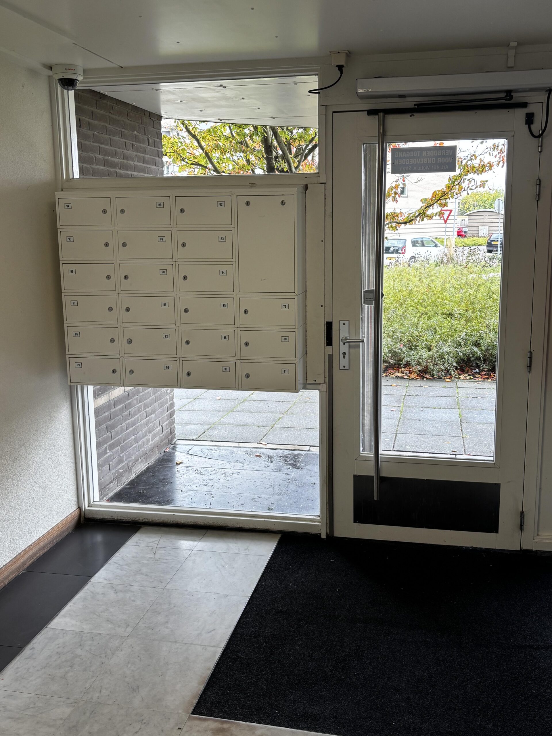 Entree van het complex met bellentableau, brievenbussen, trappenhuis, lift en toegang tot de bergingen. Er is voldoende parkeergelegenheid rondom het appartement.