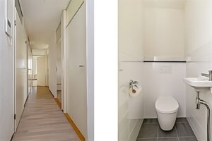 Fourth floor: Entrance: through the hallway with its doors, you'll find the spacious living/dining room. Large windows in the living room provide plenty of natural light and a beautiful view of the surrounding nature. From the living room, you have access to the closed kitchen, which features a kitchen unit with an electric hob, extractor hood, dishwasher, and a freestanding fridge-freezer. There's also ample storage space for your kitchenware. The kitchen provides access to the spacious balcony. The fully tiled bathroom has a lovely, spacious walk-in shower, a washing machine connection, and a vanity. The toilet is separate.